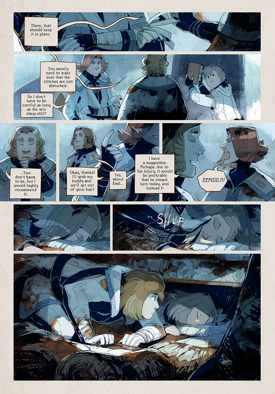 Woof, I know, I'm updating pretty late today. This gosh darn page took over 10 hours longer to finish than usual! I really underestimated how useful and time-saving the prep work I normally do during the chapter breaks is, especially the page thumbnail sketches, and jumping into a new chapter cold is easier said than done. Ended up having to redraw the sketch several times over because I had nooo Idea what kind of panels to draw for this page. But I've learned my lesson for the future: the prep work really is a necessary evil, won't be skipping that ever again. :P